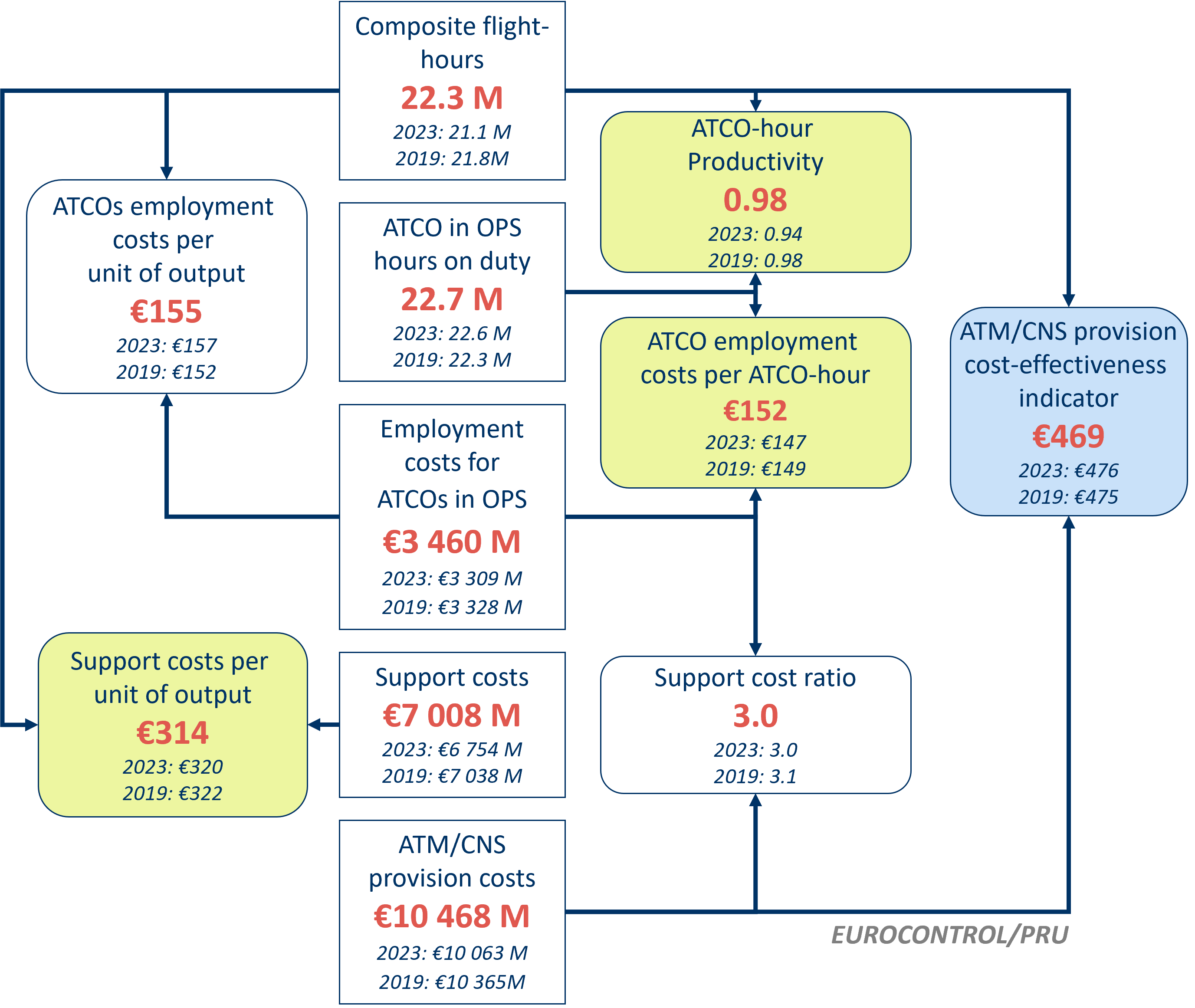 The analytical framework used in the ACE analysis to break down the ATM/CNS provision cost-effectiveness indicator into relevant economic drivers is presented in Figure 4.2. These key drivers include: