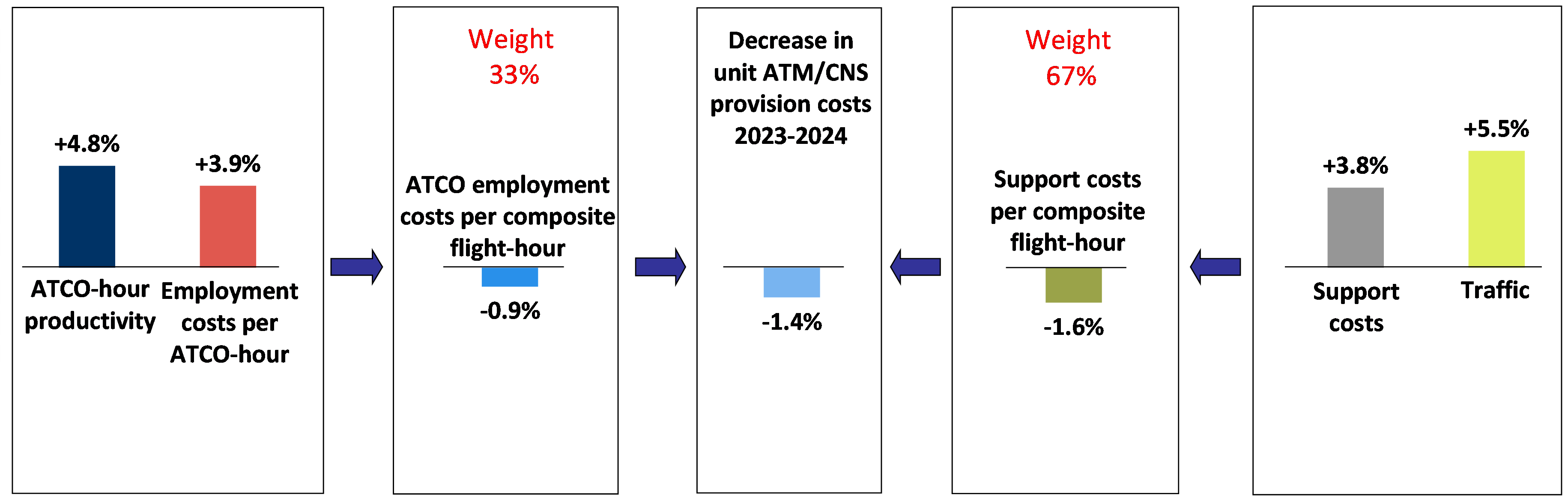 Figure 4.3 shows that in 2024, ATCO employment costs per ATCO-hour rose by +3.9% while ATCO-hour productivity rose by +4.8% compared to 2023. As a result, ATCO employment costs per composite flight-hour decreased by -0.9%. In the meantime, unit support costs fell by -1.6% due to an increase in composite flight-hours (+5.5%) being partly offset by an increase in support costs (+3.8%). Consequently, in 2024, unit ATM/CNS provision costs fell by -1.4% at the Pan-European system level compared to 2023, taking into account the relative weighting of ATCO employment and support costs based on their shares of total ATM/CNS provision costs.