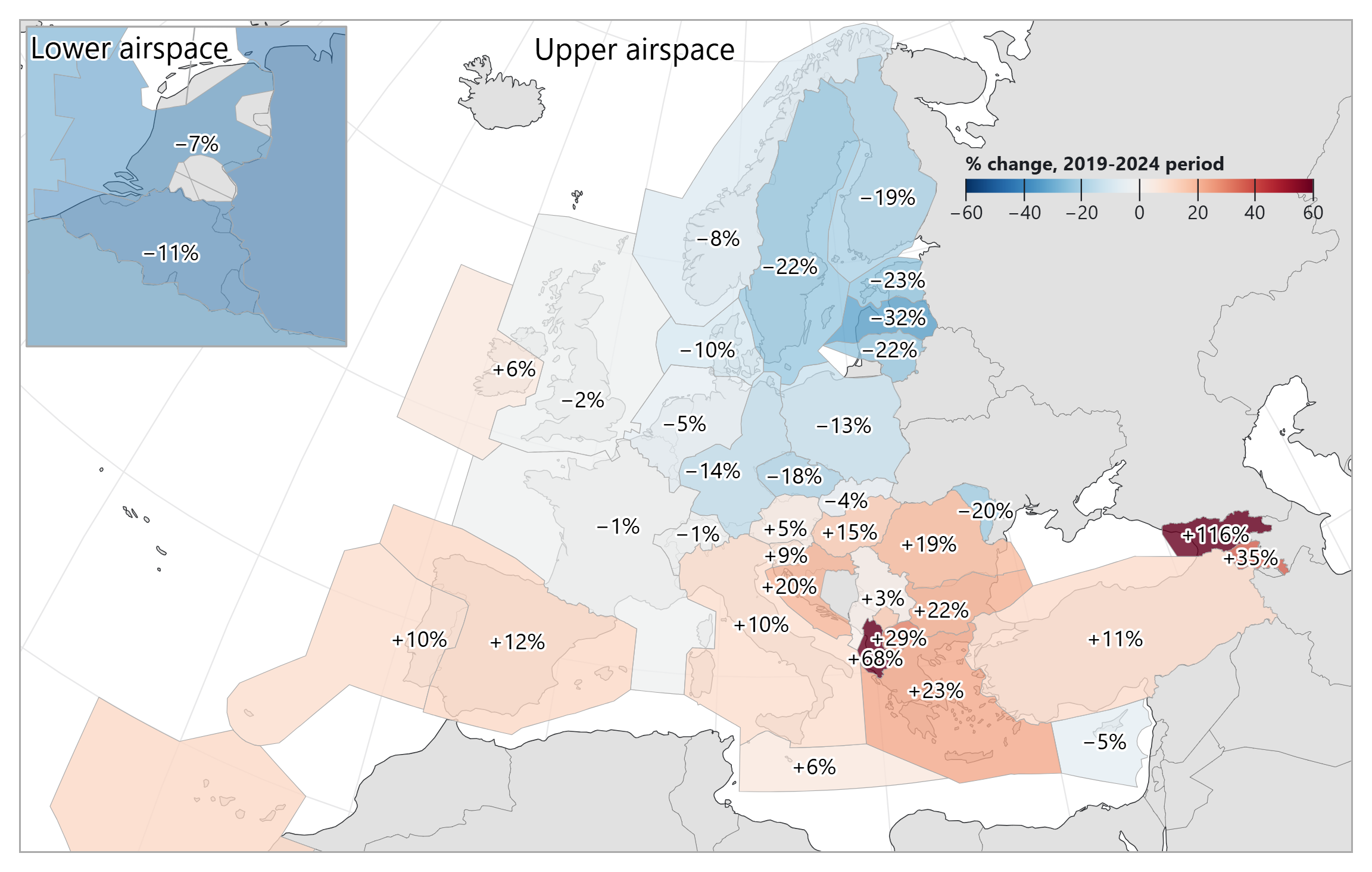 At ANSP level, traffic in 2024 showed varied patterns of recovery, influenced both by the residual effects of the COVID-19 pandemic and by the ongoing war in Ukraine, which led to significant changes in route structures and traffic volumes due to airspace closures and reciprocal sanctions on air carriers (see Figure 2.3). On the recovery side, some ANSPs such as Sakaeronavigatsia and Albcontrol recorded substantial increases in composite flight-hours, reaching +116% and +68% above 2019 levels respectively. In contrast, others like LGS and EANS remained below pre-pandemic levels, at -32% and - 23%, respectively. This inevitably impacted the levels and trends of ACE indicators for the most affected ANSPs.